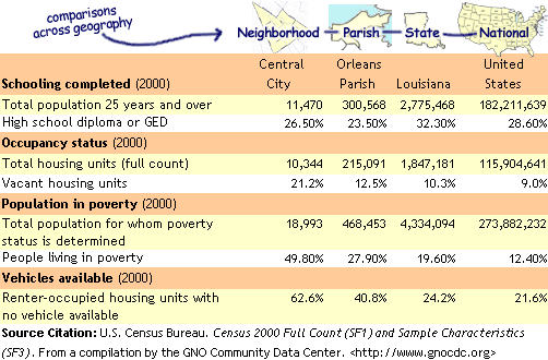 You probably already know that when youre writing a grant proposal, showing numbers that reflect the problems in our community can really be convincing. The New Orleans area tends to suffer from problems to a greater degree than most of the rest of the nation. We have higher rates of poverty, greater numbers of vacant houses, higher rates of disease, and poorer academic achievement. Using almost any indicator, you can show that the New Orleans area is worse off than the rest of the nation. These numbers really talk. But, numbers at a neighborhood level may talk even louder!