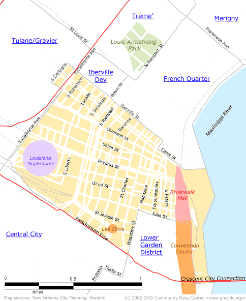 Central Business District NeighborhoodIn the last quarter of the 20th century, the Central Business District changed as radically as it did when it was developing during the 1820s and 1830s. Many of the old structures have been preserved and converted for new uses. Today this section of the city bustles with commercial, business, governmental, educational and recreational activities. [Read more in the Neighborhood Snapshot] Street map with links to nearby neighborhoods: