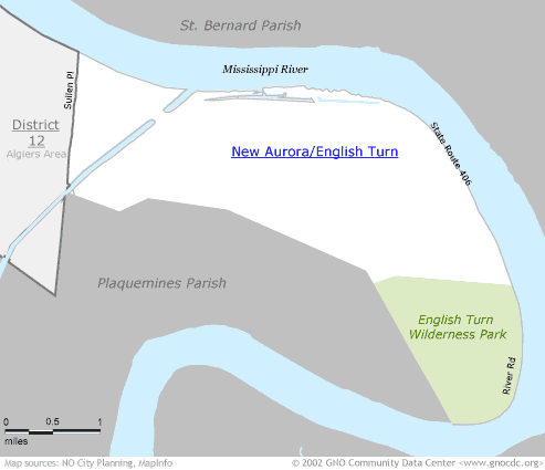The small triangle of land generally known as New Aurora (just west of the Intercoastal Waterway) is a separate Census tract that is sometimes included in the Old Aurora neighborhood in District 12, and other times included in with English Turn in District 13.