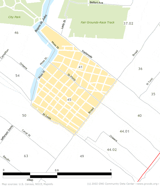 Maps of the Bayou St. John NeighborhoodNeighborhoods in the Data Center web site are made up of Census tracts. This allows the easy combination of Census data to give accurate information at the neighborhood level. Below you'll find three maps. The first of these shows Census tract boundaries, the second is a street map with the neighborhood boundaries, and the third, just for comparison, shows the zip code boundaries that fall in this neighborhood. Census tract boundaries![]() Street map boundaries![]() Zip code boundaries![]()