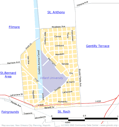 Dillard NeighborhoodThe Dillard neighborhood, whose boundaries are Mirabeau Avenue, Elysian Fields Avenue, Benefit Street, Paris Avenue, and Pratt Drive, is a mixed residential and commercial area. Small establishments nestle on corners in large residential sections while larger establishments are positioned on the main thoroughfares, especially Gentilly Boulevard and Elysian Fields Avenue. The community is composed of primarily African American families of low and middle-income levels (Census 2000). The housing stock is predominately low sprawling post-World War II houses. [Read more in the Neighborhood Snapshot] Street map with links