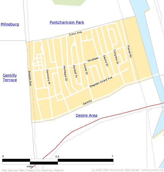 Gentilly Woods NeighborhoodGentilly Woods and Pontchartrain Park neighborhoods are separated from the Gentilly Terrace community by railroad tracks to its west and from the Pines Village communities by the Inner Navigation Harbor Canal to the east, giving the area a picture of isolation. The majority of homes are bricked, built for single family usage. It is one of the neighborhoods of predominately African Americans, and the majority of the housing units are owner-occupied (Census 2000). [Read more in the Neighborhood Snapshot] Street map with links