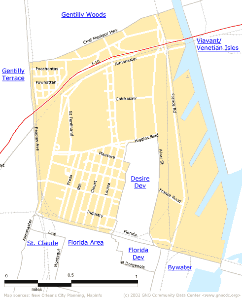 Desire Area NeighborhoodFrom its beginning, the development of the Desire area was focused primarily on infrastructure to support industry such as railroads and canals. This same infrastructure isolates residents from the rest of the city and hampers the prosperity of the neighborhood. Still Desire is a vibrant community with many assets and great pride. [Read more in the Neighborhood Snapshot] Street map with links