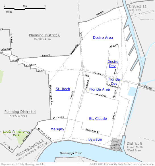 Also note that many of the neighborhoods in this district have strange shapes the "stair-steps" along the St. Roch border and the horseshoe shape of Bywater. The neighborhood pages will have more detailed street maps, but it may be valuable to refer to a detailed paper map when examining these boundaries. |