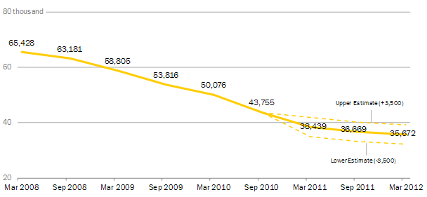 Meanwhile, in this brief we attempt to provide a reasonable range of estimates of the number of “no–stat” addresses that may exist in New Orleans as of March 2012. By holding the number of total addresses constant from September 2010, we can estimate the March 2012 number of no–stats at roughly 35,700.