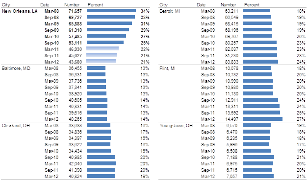 [4] Between March 2008 (when HUD first began reporting the USPS total number of residential addresses) and September 2010, the total number of addresses in New Orleans varied from a high of 216,192 in June 2010 to a low of 212,647 in June 2008 — a difference of 3,545. This 1.6 percent variation is roughly in line with the variance in total addresses in most other large U.S. cities.
