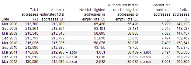 In late 2010, the USPS deleted nearly every no–stat residential address from its New Orleans address list, leaving the city with no indication of how many blighted homes remain. In March 2011, the number of no-stats suddenly dropped from 43,755 to 1,651. In this report we attempt to provide a reasonable range of estimates of the number of no–stat addresses in New Orleans. For example, our mid–point estimate for March 2012 is arrived at by subtracting the total number of addresses in March 2012 from the total number of addresses in September 2010 at the census tract–level, then adding in the number of no–stat addresses provided by USPS for March 2012 for that census tract. (For census tracts where the difference between March 2012 and September 2010 total addresses was negative, then we simply used the number of no–stat addresses provided by USPS for March 2012 as the estimate of blighted addresses and empty lots for that census tract.) Finally, we summed the census tract estimates to arrive at the mid–point estimate for the City of New Orleans.