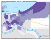 In 2006, the U.S. Department of Housing and Urban Development (HUD) began acquiring quarterly extracts of U.S. Postal Service (USPS) data and publishing this data as a possible indicator of blight and vacancy for cities nationwide. In this report, addresses coded as “no–stat” in the HUD data are used as proxies for blighted housing units in New Orleans because a parcel–by–parcel census of all properties in New Orleans is not available. “No–stats” are addresses identified by the USPS letter carrier as uninhabitable and not likely to receive mail for some time (e.g., blighted housing units, empty lots, buildings under construction and not yet occupied, and rural route addresses vacant for 90 days or longer). In the parishes affected by Hurricanes Katrina and Rita, no–stat addresses include heavily damaged homes that have not been re-occupied. In this report, addresses coded as “vacant” in the HUD data are used as proxies for vacant but habitable housing units. “Vacants” are addresses identified by the letter carrier as habitable but without mail pick up for 90 days or longer. To learn more about how the HUD data compares to other sources of USPS data, see Appendix B in the downloadable report.