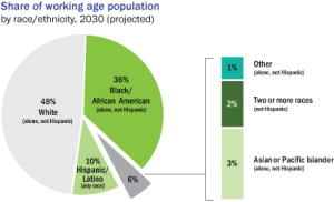 This interactive graphic illustrates population changes from 2000 to 2010, as well as population projections by race and age for five year increments until 2030. As you can see from this graphic, assuming no net in–migration, the New Orleans metro will be “majority minority” by 2030. The working age population will diversify slightly more quickly and 52 percent of working age adults in the New Orleans metro will be people of color by 2030. Fully 60 percent of children under 18 years of age will be non–white by 2030. These projections were developed as a part of the Data Center’s report “Building an Inclusive, High–Skilled Workforce for New Orleans’ Next Economy.”