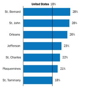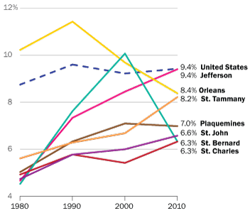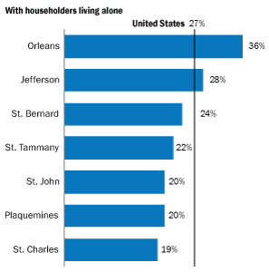The share of households that are elderly living alone has decreased within the city of New Orleans but is growing in suburban parishes. The only exception is St. Bernard, where this share declined from 2000 to 2010.