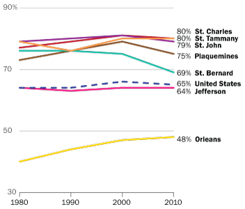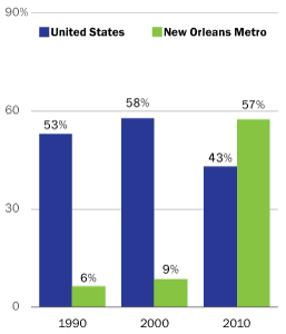 New Census 2010 data suggests that the New Orleans metro may be bucking stereotypical notions about cities and suburbs. Suburban parishes, like Jefferson and St. Tammany, experienced the most significant growth among Hispanic and Vietnamese populations. And nearly every suburban parish has a higher rate of single–parent households than the national average. Meanwhile, homeownership declined in New Orleans’ suburbs, but grew within the city itself. The share of elderly living alone grew in most suburbs while shrinking in the city. These trends suggest that leaders may need to reconsider how to supply housing and other services to better accommodate new demographic realities around the region.
