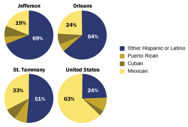 Today Jefferson is home to the largest number of Hispanics in the metro (53,702), 19 percent of whom are Mexican, 7 percent are Cuban, 5 percent are Puerto Rican, and 69 percent are “other.” Orleans has the second largest number of Hispanics (18,051), 24 percent of whom are Mexican, 7 percent are Cuban, 5 percent are Puerto Rican, and 64 percent are “other.” And St. Tammany now also has a sizable number of Hispanics (10,970), 33 percent of whom are Mexican, 7 percent are Cuban, 9 percent are Puerto Rican, and 51 percent are “other.”