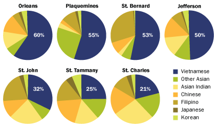 The New Orleans metro has served as a U.S. gateway for Vietnamese immigrants with large concentrations settling in Jefferson and Orleans parishes. Plaquemines and St. Bernard also have significant Vietnamese populations relative to their small population size.
