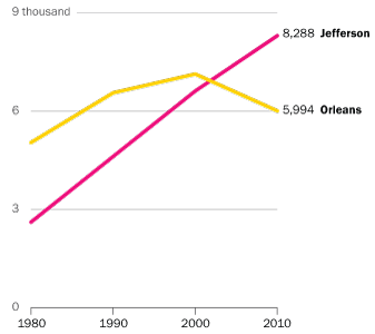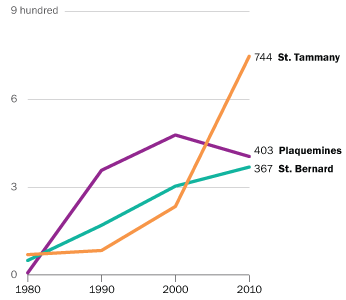 Over the last ten years, the Vietnamese populations have shifted toward Jefferson and St. Tammany and away from Orleans and Plaquemines. From 2000 to 2010, the number of Vietnamese in Jefferson Parish grew by 1,687 and in St. Tammany by 511. St. Bernard has also experienced an uptick in its Vietnamese population, despite its overall population loss. In Orleans, the number of Vietnamese decreased but at a lesser rate than the overall population loss rate for the parish. Today the number of Vietnamese in Jefferson is now one–third larger than in Orleans.