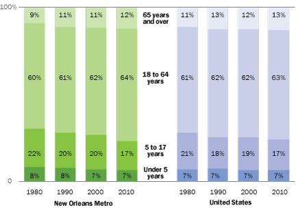 In 1980, the New Orleans metro area population had slightly larger shares of children under five years old (8.3 percent) and school age children 5 to 17 years old (22.3 percent) than the national average (7.2 and 20.9 percent respectively). At that time elderly 65 years and over represented a smaller share of the metro population (9.1 percent) than the national average (11.3 percent), as did working adults 18 to 64 (60.4 percent compared to 60.6 percent nationally).