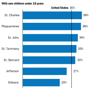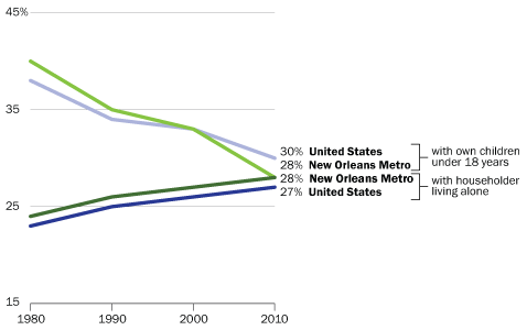 Single–parent households are a growing phenomenon nationally as well as locally, but the New Orleans metro has larger shares of single–parent households than the national average.