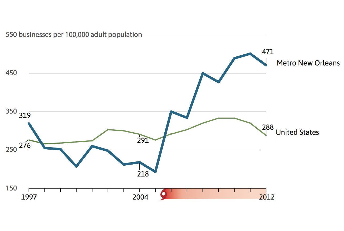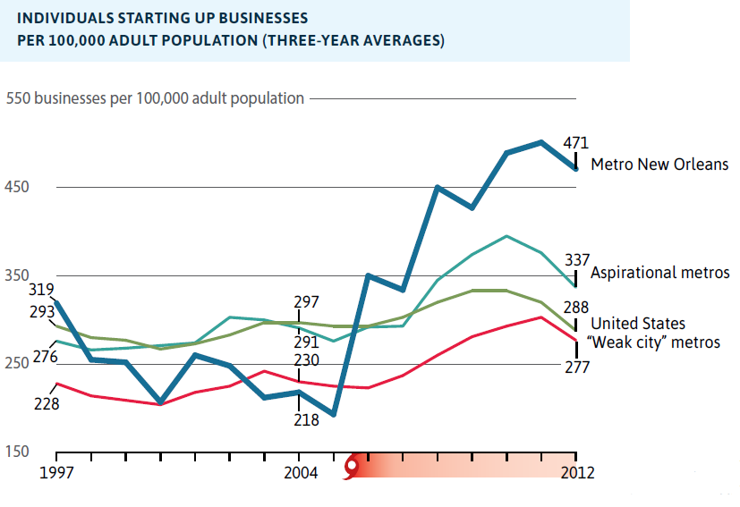 - The metro New Orleans entrepreneurship rate—at 471 startups per 100,000 adults during the three year period from 2011-13—is 64 percent higher than the national average, and 40 percent higher than other fast-growing Southern metros.