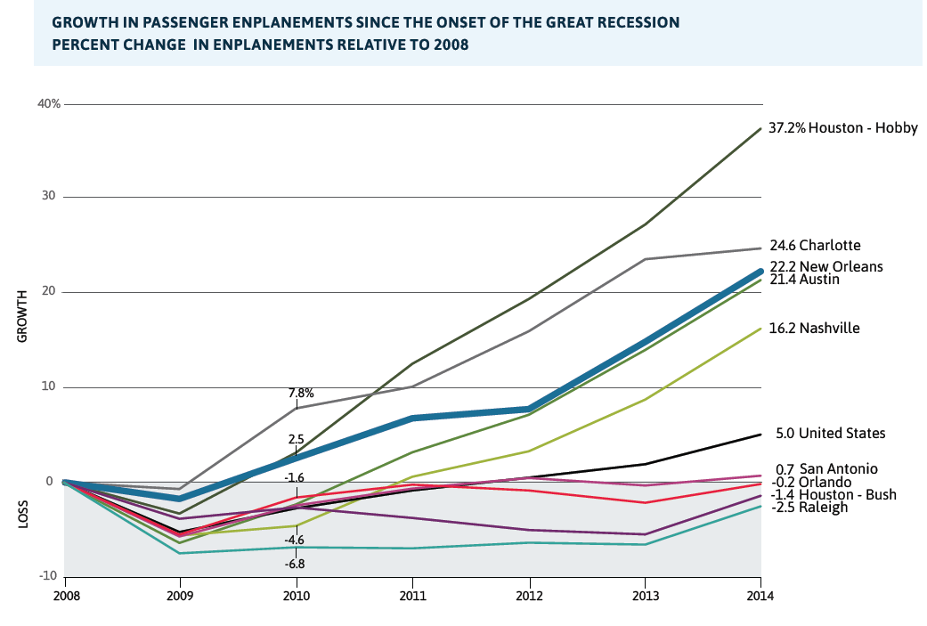 - By 2014, passenger enplanements in Louis Armstrong International airport surpassed 2008 levels by 22 percent—while national air traffic had recovered to only 5 percent above pre-recession numbers. In fact, by 2014, New Orleans passenger enplanements had surpassed their 2004 pre-Katrina high mark—indicating that the New Orleans airport is providing expanded connectivity for Southeast Louisiana visitors, residents, and businesses.