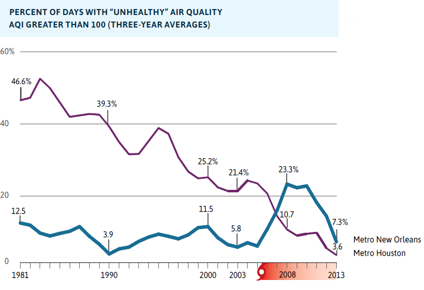 Scholars studying disasters spanning more than a century concluded that disasters tend to accelerate pre-existing trends. This did not bode well for metro New Orleans, which had very weak population and job growth and high poverty levels pre-Katrina. However, in a few case studies, a region was able to break from historic trajectories, bouncing back better than before. The ability to rebound to pre-stress or better than pre-stress trend lines is influenced by a region’s resilience capacity.