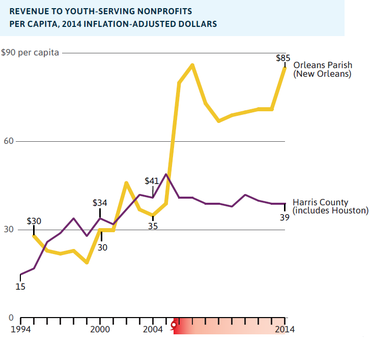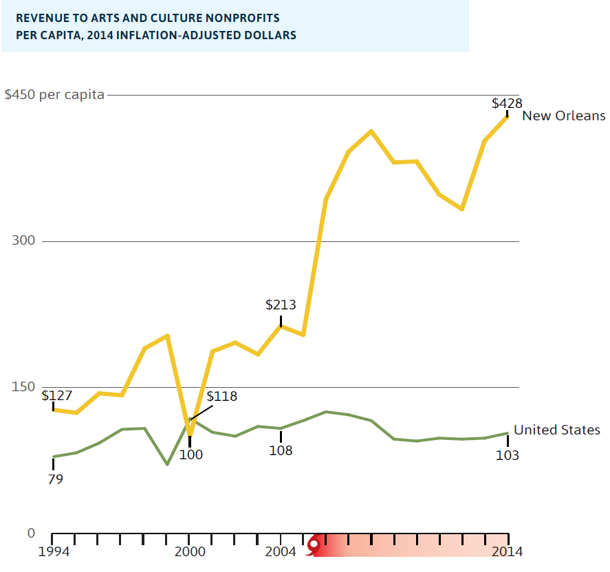 Ten years after Katrina, the regional economy is embarking on a new path, benefitting from new infrastructure investments, a more diverse set of clusters, and an entrepreneurship boom. The region has solidified its commitment to culture with revenues to arts nonprofits now four times the national average. Similarly revenues to youth development nonprofits have doubled, and public school improvements are measurable. Importantly incarceration rates have dropped by nearly half as the city has dedicated itself to reforming its criminal justice system. New Orleanians have worked hard to not only rebuild, but to transform and better their institutions. By many accounts, New Orleanians’ love of their home, high levels of citizen engagement, and dedication to improving their community have been key strengths that have fueled the region’s resilience.