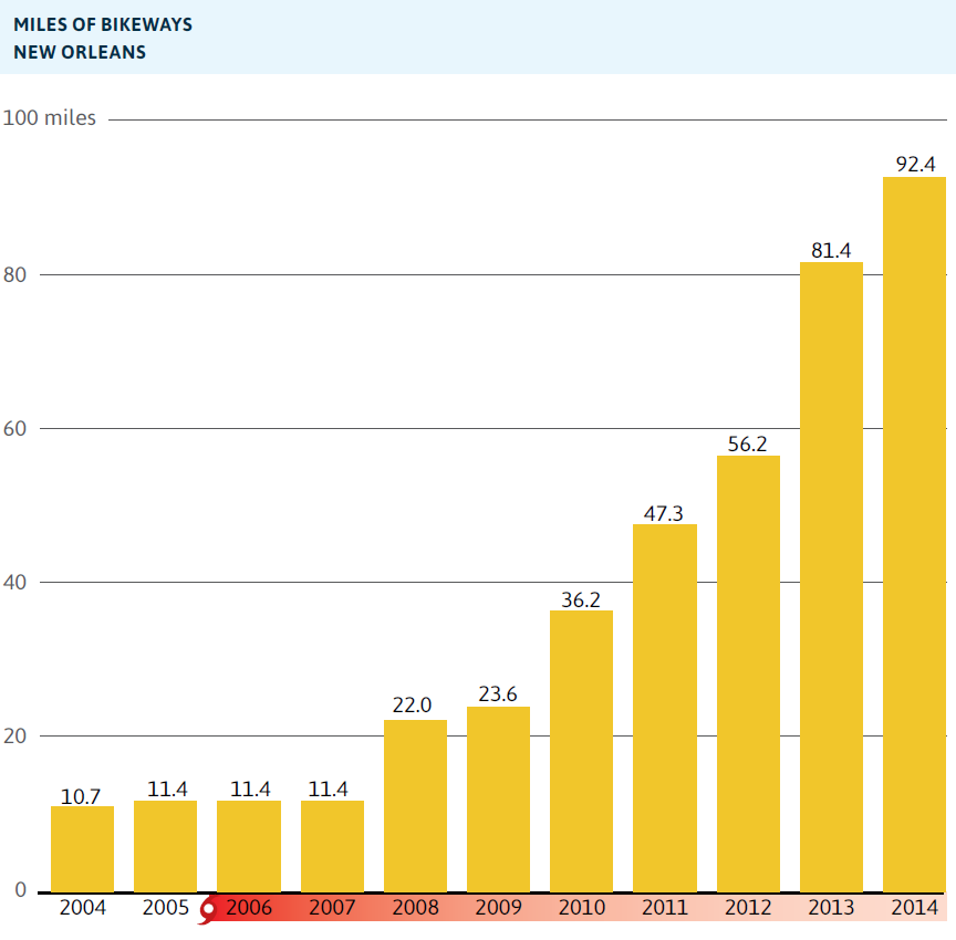 - Bike lanes and pathways have increased more than eightfold in New Orleans from 11 miles in 2004 to 92 miles in 2014.