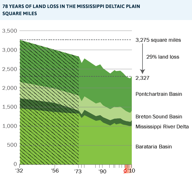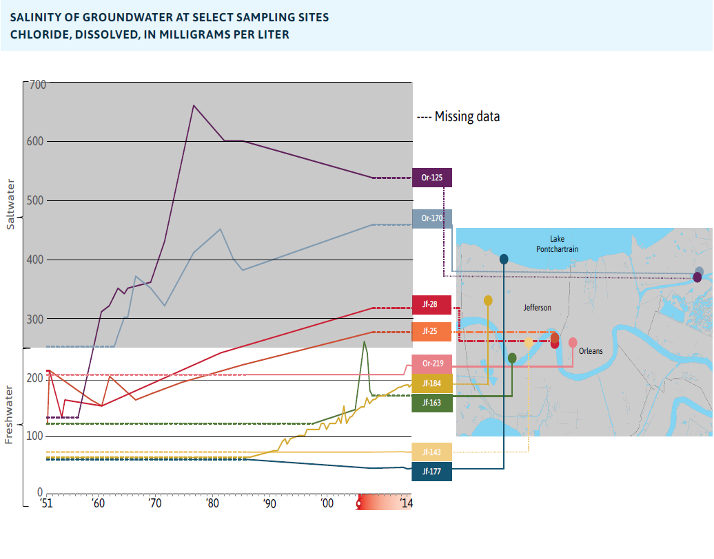- Not only has the metro lost 29 percent of the coastal wetlands that protect it from storm surge since 1932, but measurements within the levee walls since 1951 demonstrate that saltwater is encroaching, with eight of nine groundwater sample sites registering increasing salinity.