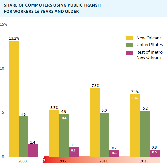 - The share of commuters using public transit in New Orleans is only 7 percent in 2013, down from 13 percent in 2000, and in the rest of the metro, the share has remained flat at barely 1 percent since 2000.