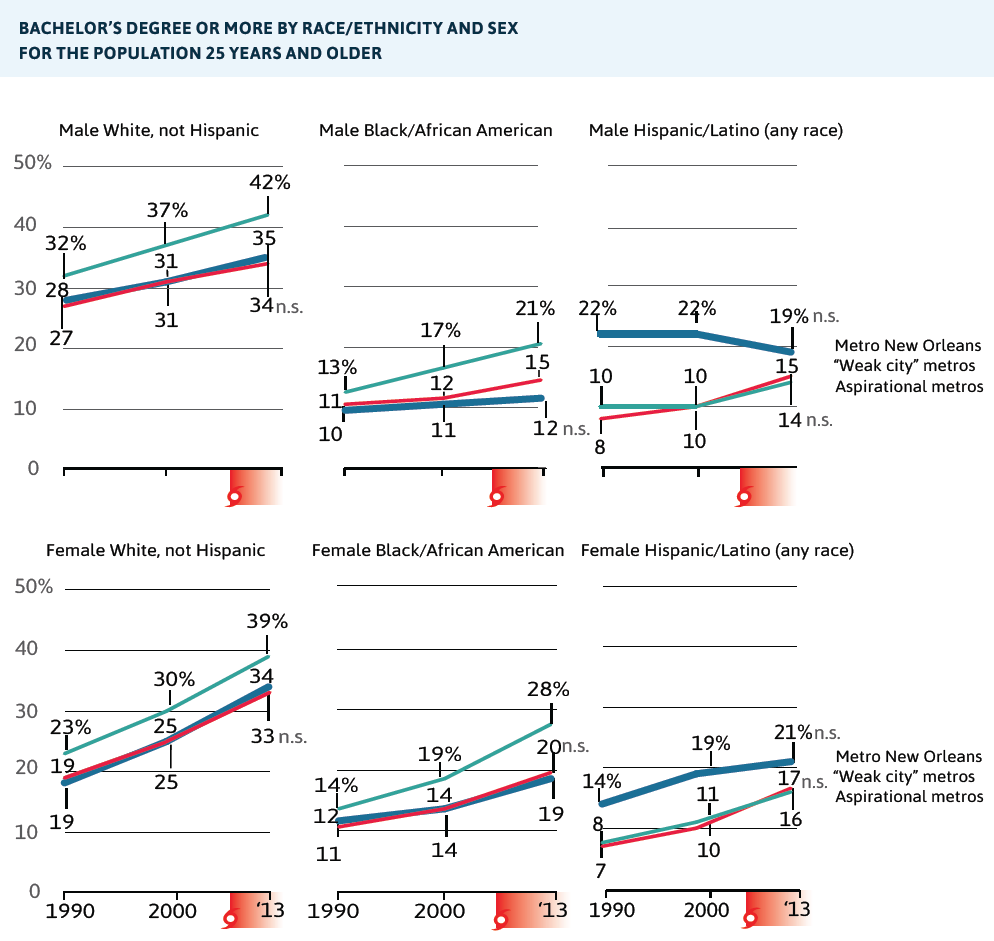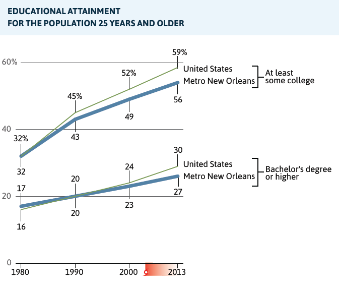 - Metro New Orleans lags the nation in producing and attracting workers with a bachelor’s degree. By 2013, only 27 percent of adults in the metro had at least a 4-year degree compared to 30 percent nationwide, and the gap between metro New Orleans and the nation has been widening since 1990.