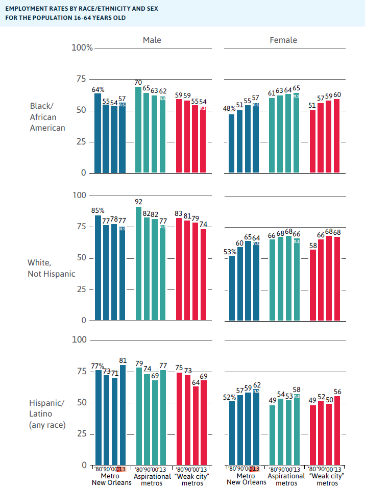 - Employment rates for white men in metro New Orleans, at 77 percent, are on par with fast-growing Southern metros. In contrast, with just 57 percent employed as of 2013, black men in metro New Orleans have employment rates that are significantly lower than fast-growing Southern metros, where 62 percent of black men are employed.