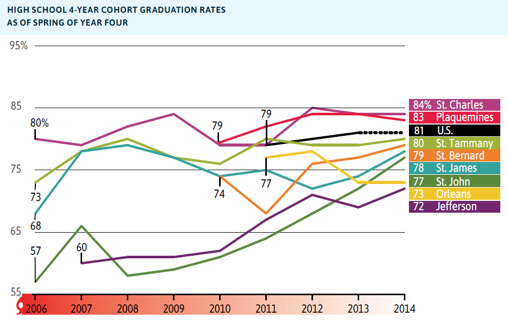 - Although the quality of public schools are increasing, graduation rates across the metro remain low, indicating that more needs to be done to improve youth out- comes. Public schools in six of eight metro parishes have graduation rates consis- tently below 80 percent.