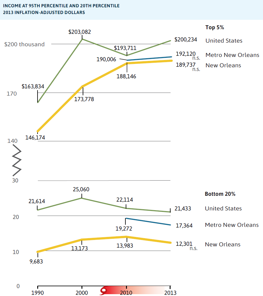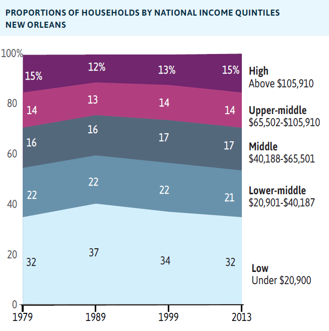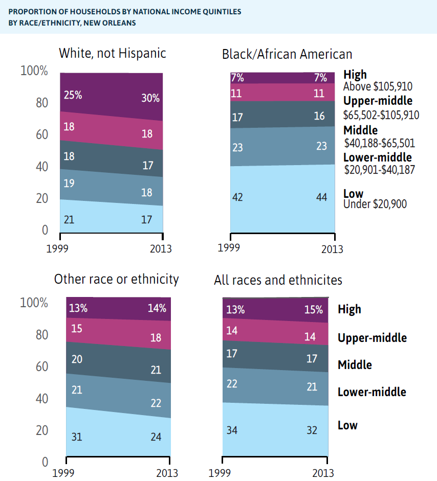 - The share of New Orleans’ white households in the top national income quintile expanded from 25 percent in 1999, such that by 2013, 30 percent of white households earned more than $105,910. In contrast, black households experienced no growth in the top earning tier. Instead, black households experienced growth only in the lowest national income tier. In 1999, 42 percent of New Orleans’ black households earned in the lowest national income quintile. By 2013, 44 percent of black households earned in the lowest tier (less than $20,900).