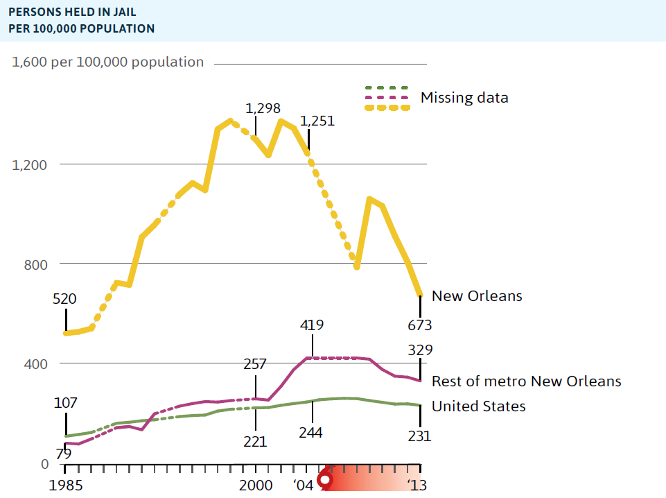 - Jail incarceration rates in New Orleans have fallen from five times the national rate in 2004 to roughly three times the national rate in 2013. Excluding state prisoners, the Orleans Parish incarceration rate was still more than twice that of the nation as of 2013.