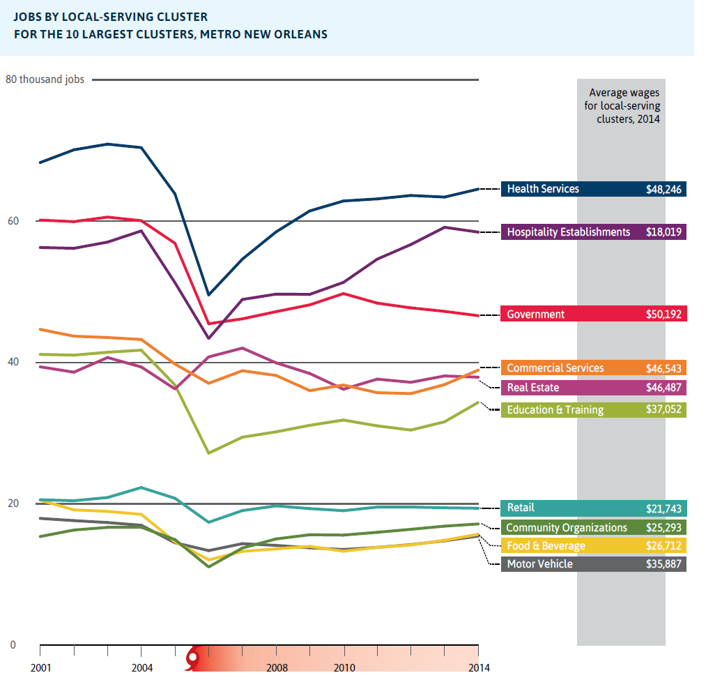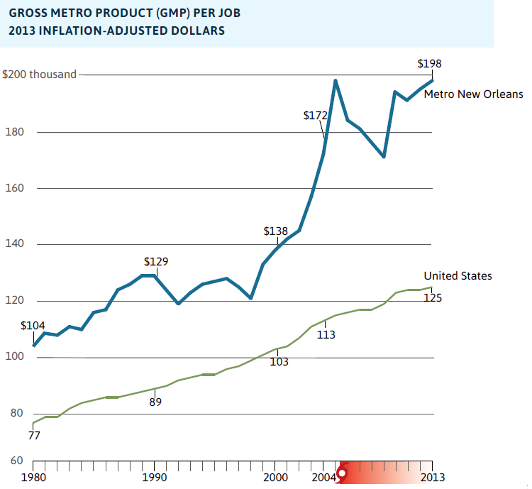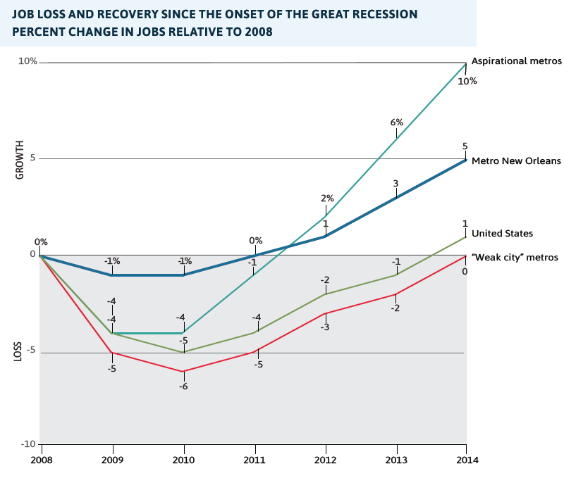 - From 2008 to 2010, metro New Orleans lost only 1 percent of jobs compared to 5 percent lost nationwide. By 2014, metro New Orleans had recouped these losses and reached 5 percent above its 2008 level, while the nation reached only 1 percent above its 2008 level.