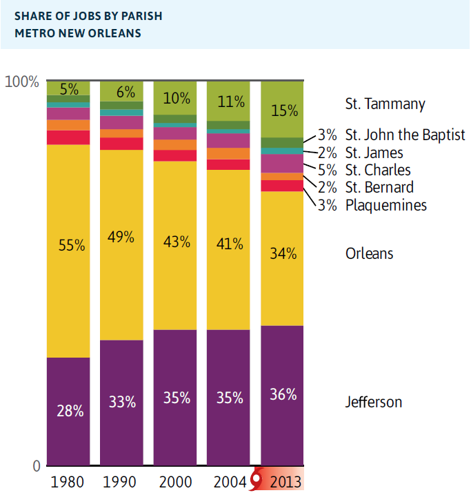 - Job centers have shifted across the region. Parishes upriver and on the north shore are now home to 24 percent of all the metro’s jobs.