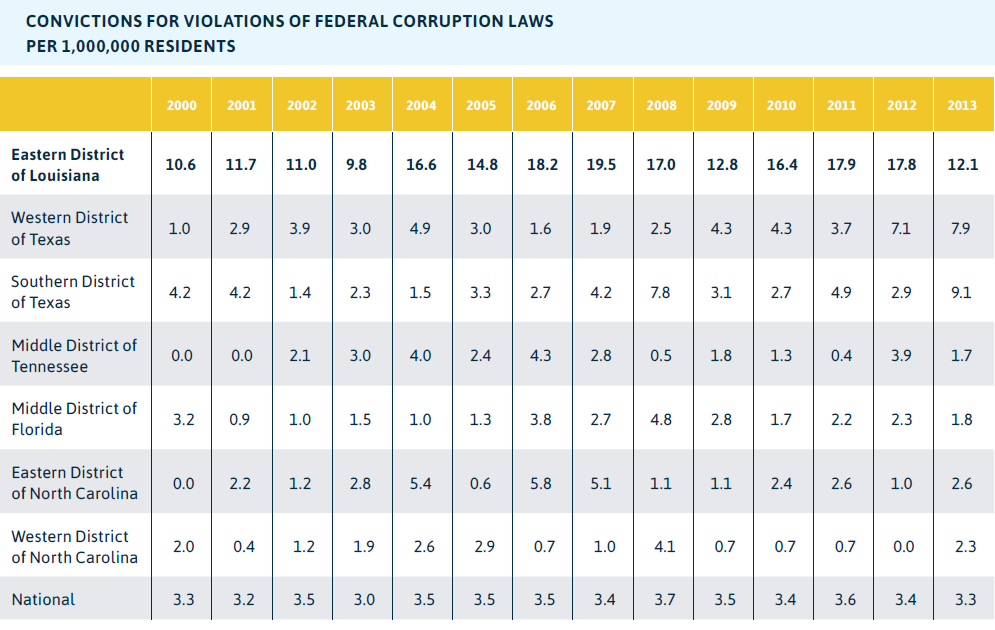 - Even before Katrina in 2004, federal corruption convictions picked up pace in the New Orleans area. From 2004 to 2013, there were an average of 26 corruption convictions per year, well above the 18 conviction annual average from 1998 to 2003— indicating a stepped up effort to enforce corruption laws in the region.
