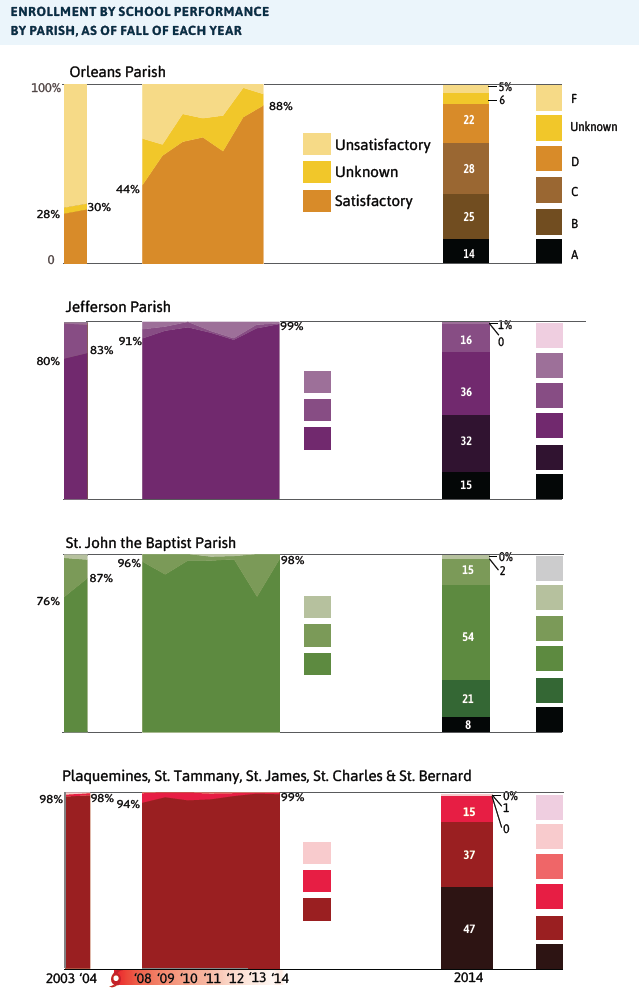 - In 2004, only 30 percent of students in New Orleans attended schools that passed state standards. Ten years later, 88 percent of students attend satisfactory schools in New Orleans. However, a more refined analysis reveals that only 39 percent of New Orleans students are in schools rated “A” or “B.” In Jefferson Parish, only 46 percent of students are in “A” or “B” schools.
