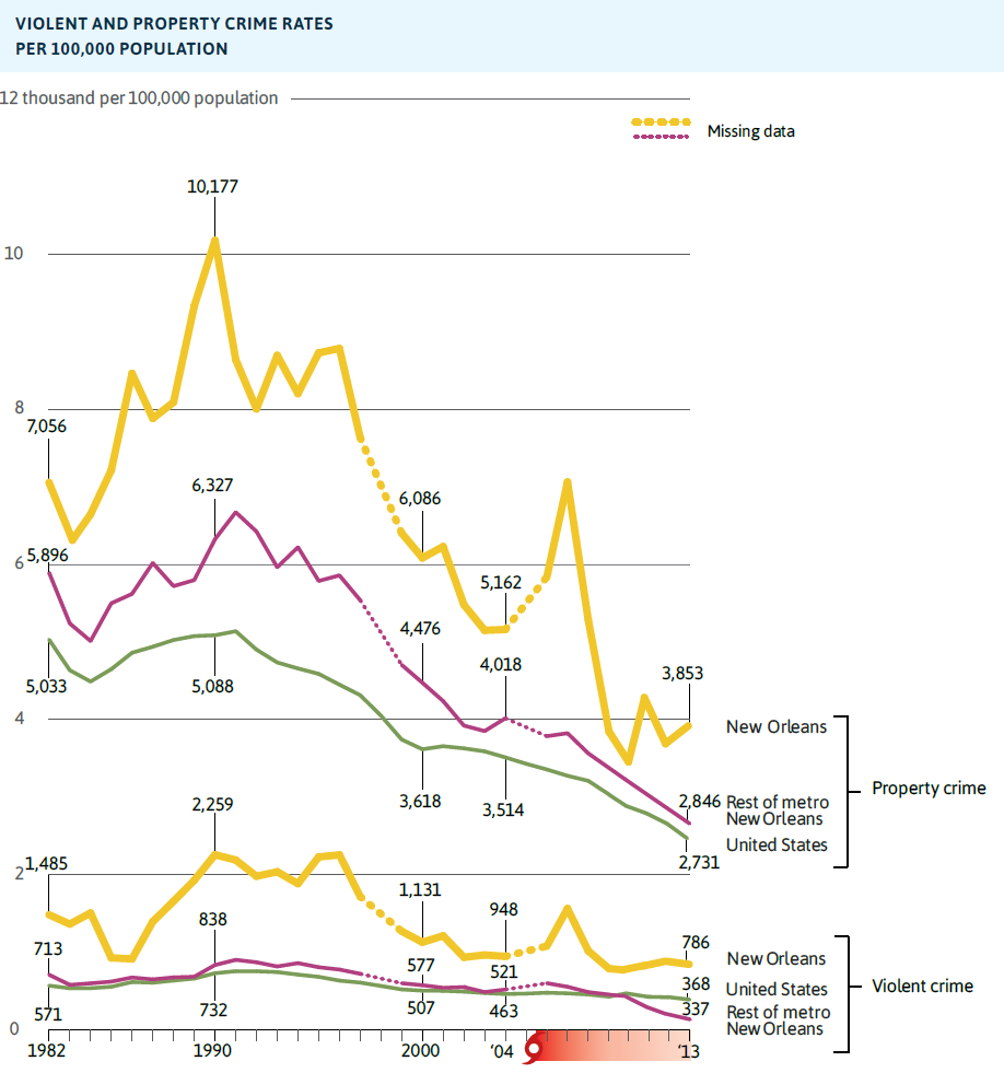 - In 2004, violent crime rates in New Orleans were almost twice the national average. By 2013, both local and national violent crime rates had fallen by 17 and 21 percent respectively.