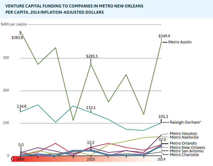 - Venture capital funding, which is critical to innovation and economic cluster development, has doubled in metro New Orleans from $16 per capita in 2010 to $32 per capita in 2014. But this is only a fraction of the venture capital going to startups in competitive metro Austin, where funding has consistently been over $100 per capita since 2006.