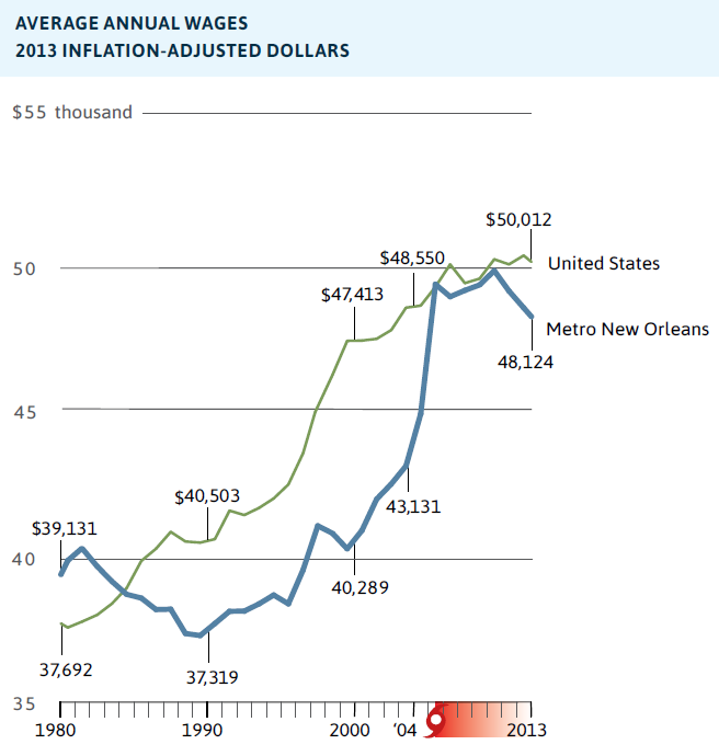 Despite economic and reform-driven progress, however, the poverty rate in New Orleans has risen to pre-Katrina rates and is now a crushingly high 27 percent. In the surrounding parishes, the poverty rate has grown to 16 percent. While white males have seen increasing employment rates, black males have not, and by 2013, black households earned 54 percent less than white households in metro New Orleans. On these and other indicators of inclusion, metro New Orleans is performing worse than the nation and other fast-growing southern metros. But the most existential issue that New Orleans faces is coastal erosion and sea level rise. Since 1932, the New Orleans region has lost nearly 30 percent of the land that forms its protective buffer from hurricane storm surge, and saltwater is increasingly infiltrating groundwater within the levee walls.