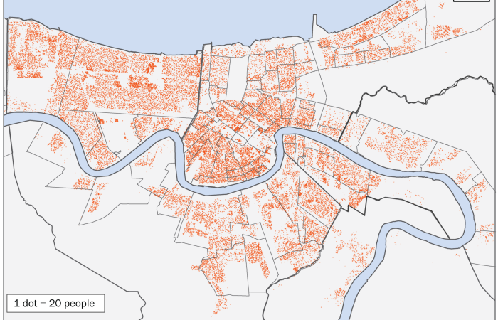In New Orleans, poverty is not evenly spread across the city, but is concentrated in certain neighborhoods. Because family composition is highly correlated with poverty, the geography of poverty and single-parent families follow a consistent spatial pattern as depicted in the maps below.xii