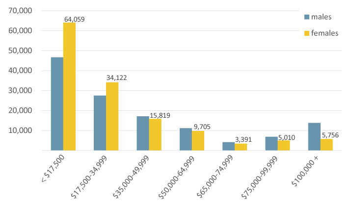 Given that 82 percent of New Orleans families with children have at least one working parent, how could it be that 39 percent of all New Orleans children live in poverty? The answer may lie partially in the large number of low-wage jobs offered in the New Orleans area. A larger share—12 percent—of full-time, year-round workers in the New Orleans metro earn less than $17,500 per year, as compared to only 8 percent nationally. And female workers who live in the city of New Orleans itself are more likely than male workers to earn low wages. According to 2013 Census data, more than 64,000 working women in New Orleans earned less than $17,500 in the prior 12 months through either full-time or part-time work.