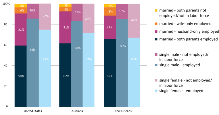 Despite high poverty rates, single mothers in New Orleans are more likely to be employed than not. All told, 67 percent of New Orleans’ single mothers are working. To be sure, all parents of children under 18 in New Orleans are more likely to be working than not. Of all families with children in New Orleans, 82 percent have at least one working parent. And both parents are working in 66 percent of all married-couple families with children.