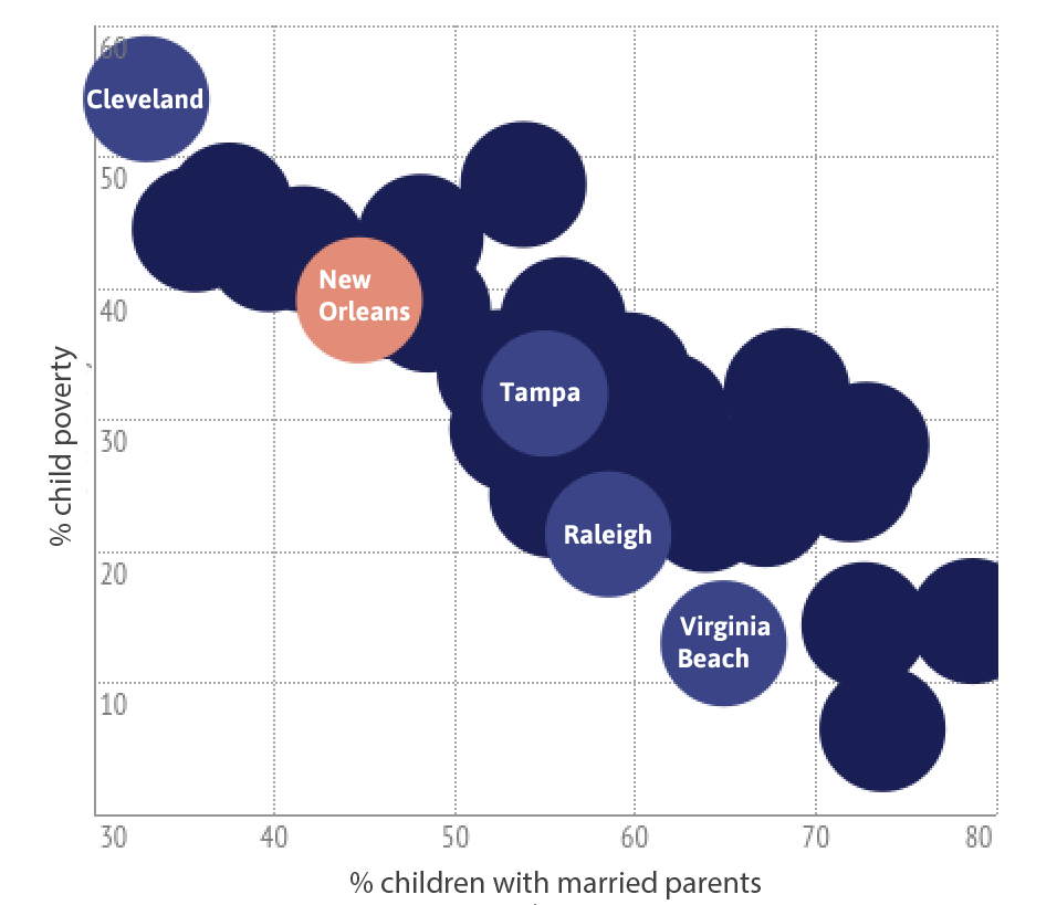 In New Orleans, the share of children in single-mother families has remained stubbornly high at roughly 48 percent since 2000. While the economic prospects for many mothers and children are not good in New Orleans, marriage is not likely to improve them, given that less than half of all working age, African American men have employment.viii Singer Jesse James’ 1988 song entitled I Can Do Bad By Myself, includes the lyrics, “I can do bad by myself. I don’t need no help to starve to death.” These lyrics may sum up the desirability of marriage for many New Orleans families in poverty.