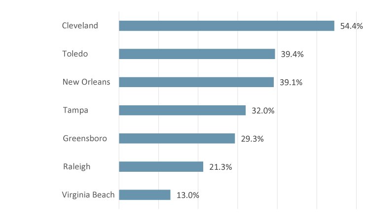 The child poverty rate in New Orleans is fully 17 percentage points higher than the national average. Moreover, it is higher than in many comparable U.S. cities. Among the 39 cities with populations between 275,000 and 600,000, New Orleans has the 9th highest child poverty rate. This is particularly concerning given that many of the cities with higher child poverty rates, such as Cleveland, are not experiencing an economic renaissance as in New Orleans.ii Moreover, child poverty in New Orleans is significantly higher than in many cities that New Orleans might aspire to be compared with, such as Tampa and Raleigh.