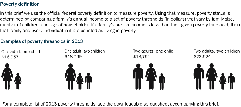 Data on children living with parents by family type, and employment status of parents with children by family type represent only families with a child under 18 years of age who is a son or daughter by birth, stepchild or an adopted child of the householder. Data on poverty status for families with children by type represent families with any child under 18 years of age who is related to the house-holder by birth, marriage, or adoption. The Census’ tabulation of “related” children was selected for the calculation of poverty status to ensure comparability between 2000 and 2013 data.