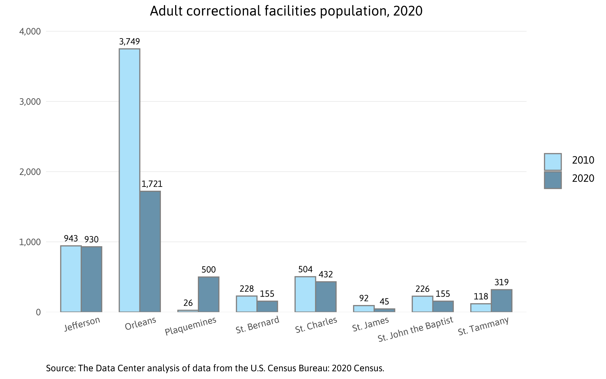 The number of people in adult correction facilities in Orleans Parish fell from 3,749 in 2010 to 1,721 in 2020—largely due to intentional efforts to reduce the size of the local jail. Still, about 0.45% of the New Orleans population was counted in an adult correctional facility compared to 0.21% of the Jefferson Parish population. Plaquemines has had a large increase in its adult correctional population, which now represents 2.13% of that parish’s population—likely due to an overly large, FEMA-funded jail that opened in that parish in 2015.