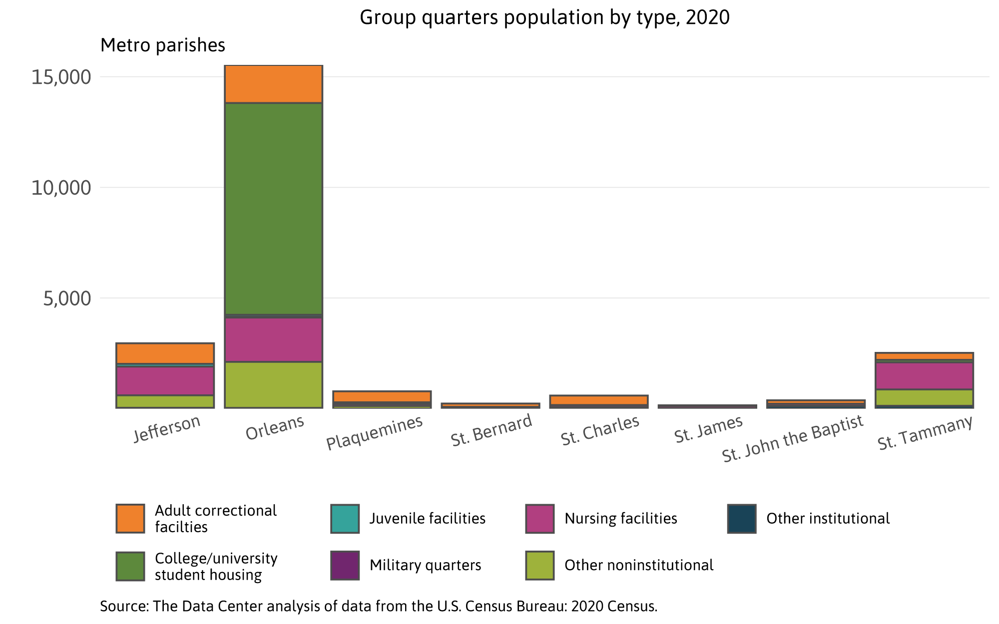 Fully 23,152 people live in group quarters in metro New Orleans, of which more than half of whom live in the city of New Orleans and are primarily college students.