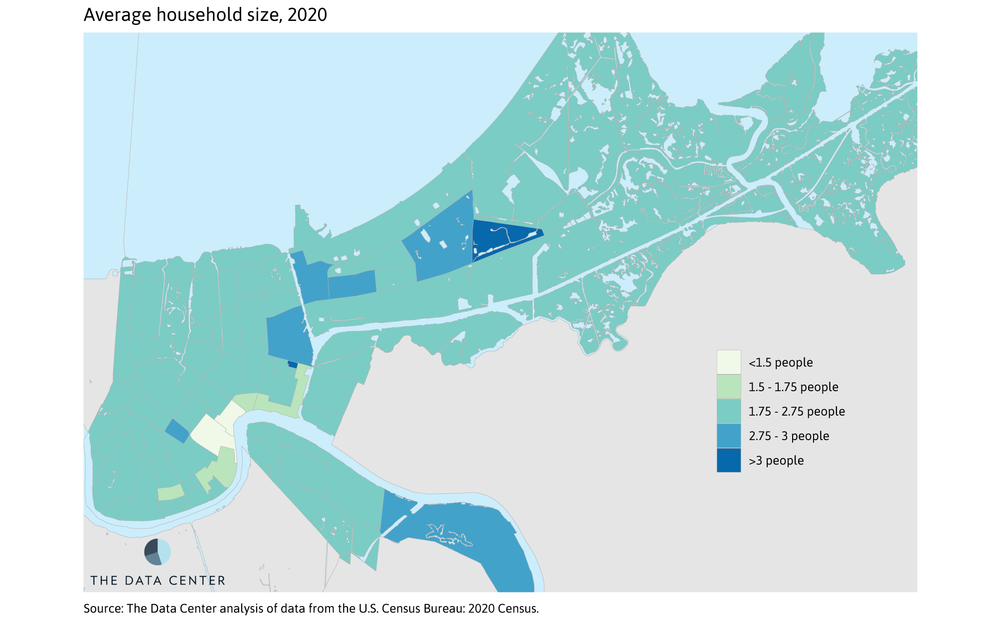Allison Plyer, ”Changes in Household Size and Group Quarters Populations Across the New Orleans Metro,“ The Data Center, May 17, 2011, www.datacenterresearch.org/reports_analysis/average-household-size-and-group-quarters/