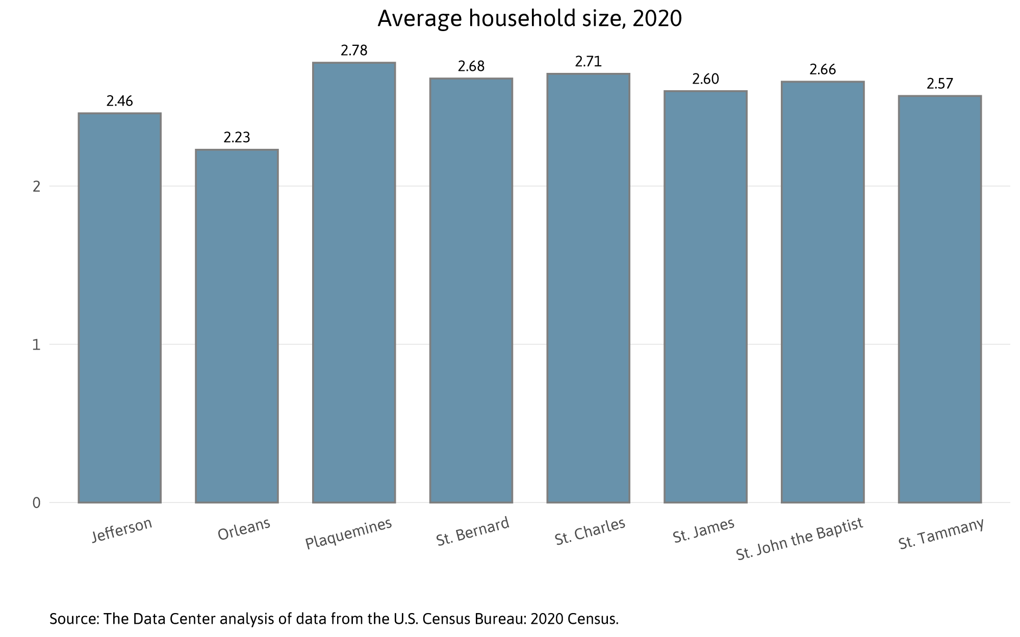 However, average household size in metro New Orleans has continued a downward trend. From 2010 to 2020, metro New Orleans average household size fell from 2.53 to 2.44. New Orleans has the lowest average household size in the metro at 2.23 and Plaquemines has the highest average household size at 2.78.