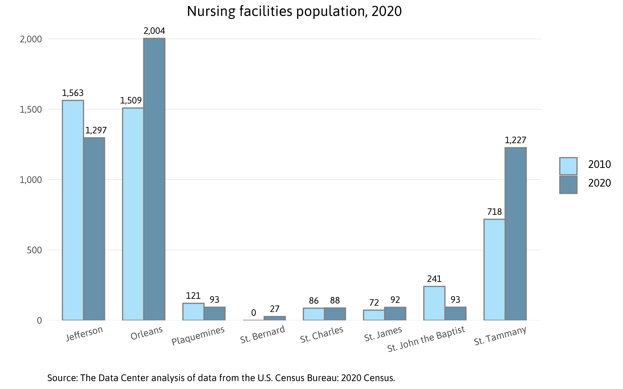 The number of people in nursing homes grew in Orleans and St. Tammany parishes, which is not surprising given the aging of the baby boomers. However, the nursing home population declined in Jefferson Parish, but remains substantial. Currently, Orleans, Jefferson, and St. Tammany have 2,004, 1,297, and 1,227 residents in nursing facilities, respectively.